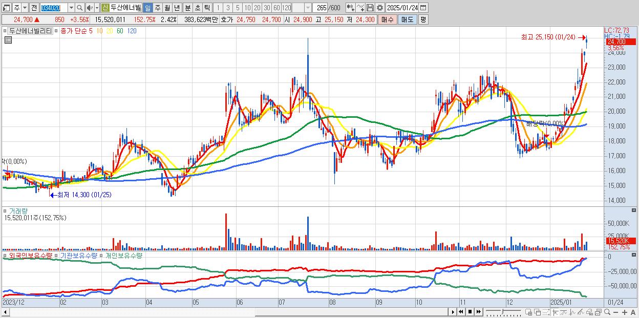 - 두산에너빌리티 (24,700원 ▲ 3.56% , 시총: 158,219억, 외국인 순매수 거래금:206억)