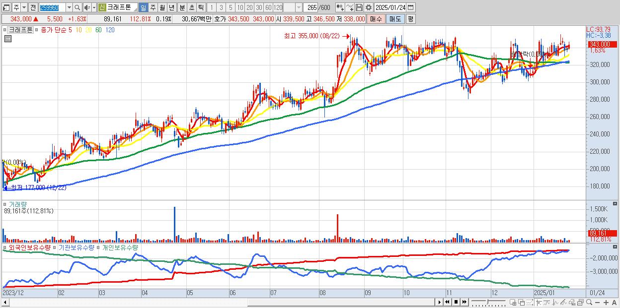 - 크래프톤 (343,000원 ▲ 1.63% , 시총: 164,323억, 외국인 순매수 거래금:71억)
