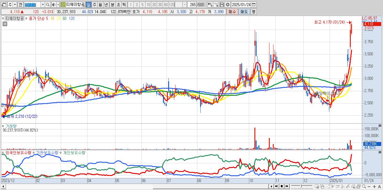 - 티웨이항공 (4,110원 ▲ 3.01% , 시총: 8,852억, 외국인 순매수 거래금:97억)