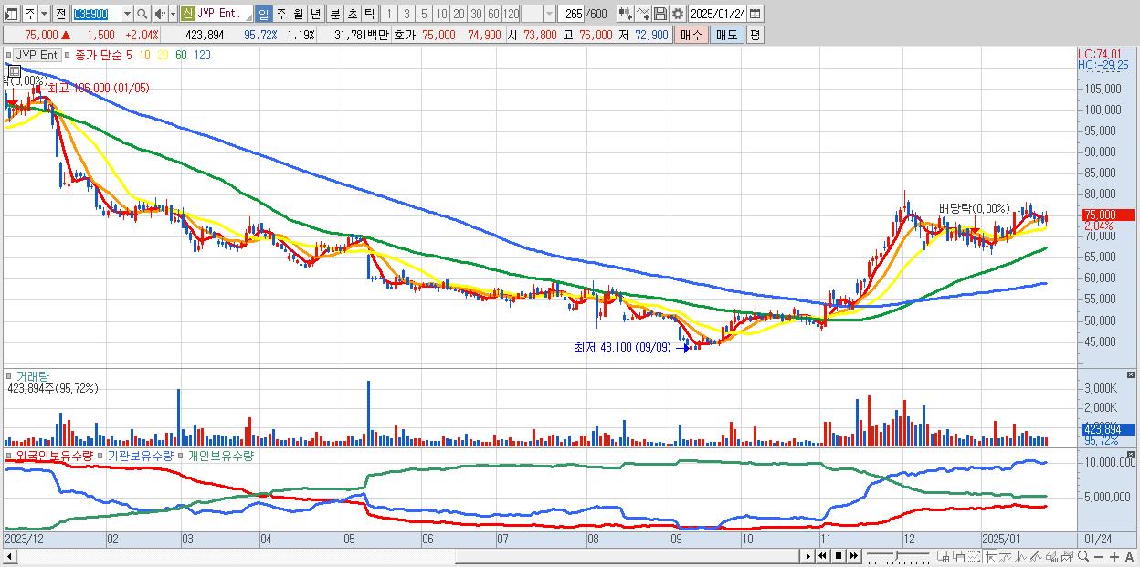 - JYP Ent. (75,000원 ▲ 2.04% , 시총: 26,649억, 외국인 순매수 거래금:58억)
