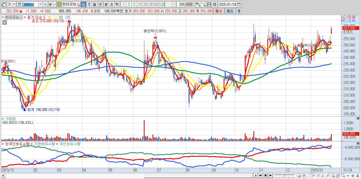 - 현대모비스 (263,500원 ▲ 4.56% , 시총: 245,042억, 외국인 순매수 거래금:285억)