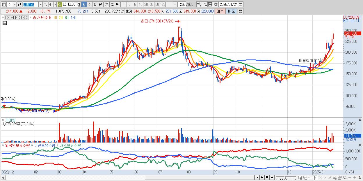 - LS ELECTRIC (244,000원 ▲ 5.17% , 시총: 73,200억, 외국인 순매수 거래금:216억)
