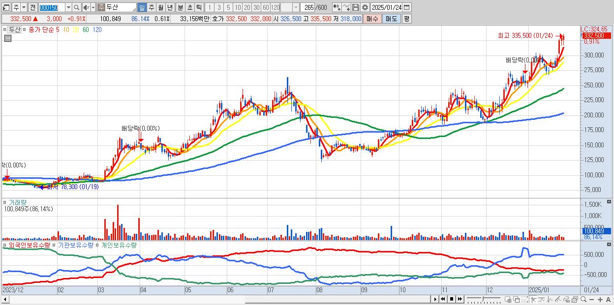- 두산 (332,500원 ▲ 0.91% , 시총: 54,942억, 거래량: 100,849, 거래대금:332억, KOSPI)