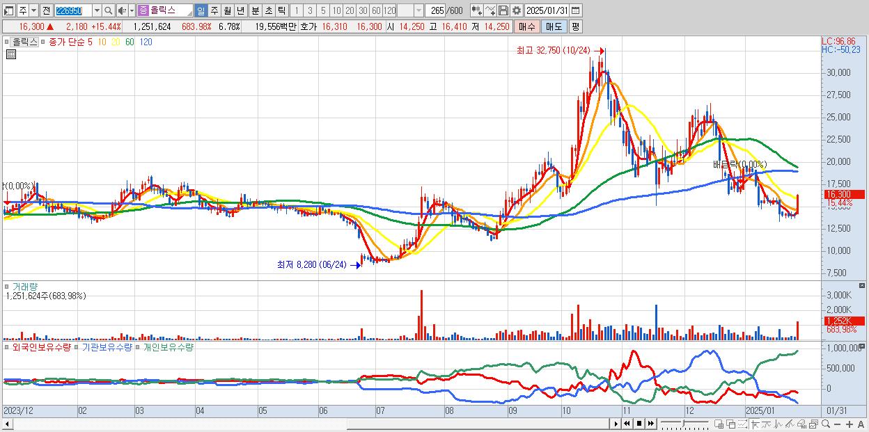 - 올릭스 (16,300원 ▲ 15.44% , 시총: 3,009억, 거래량: 1,251,624, 거래대금:196억)