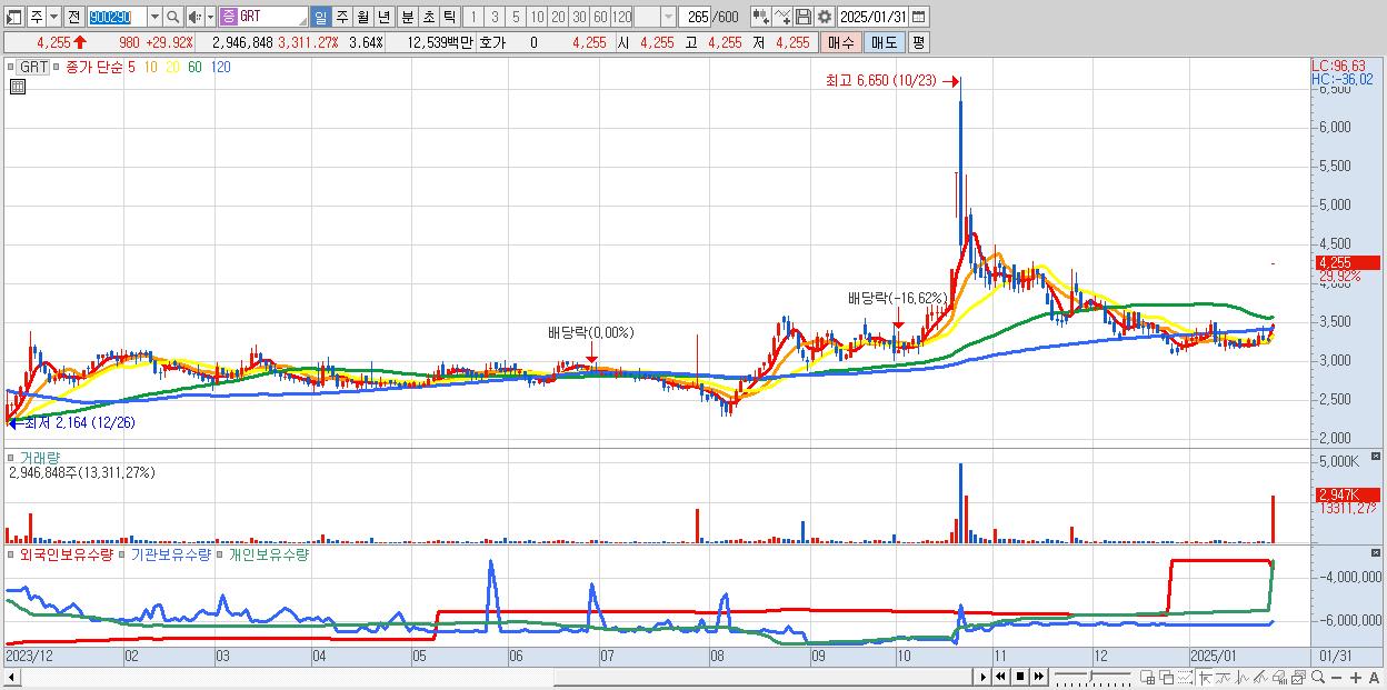 - GRT (4,255원 ▲ 29.92% , 시총: 3,440억, 거래량: 2,946,848, 거래대금:125억)