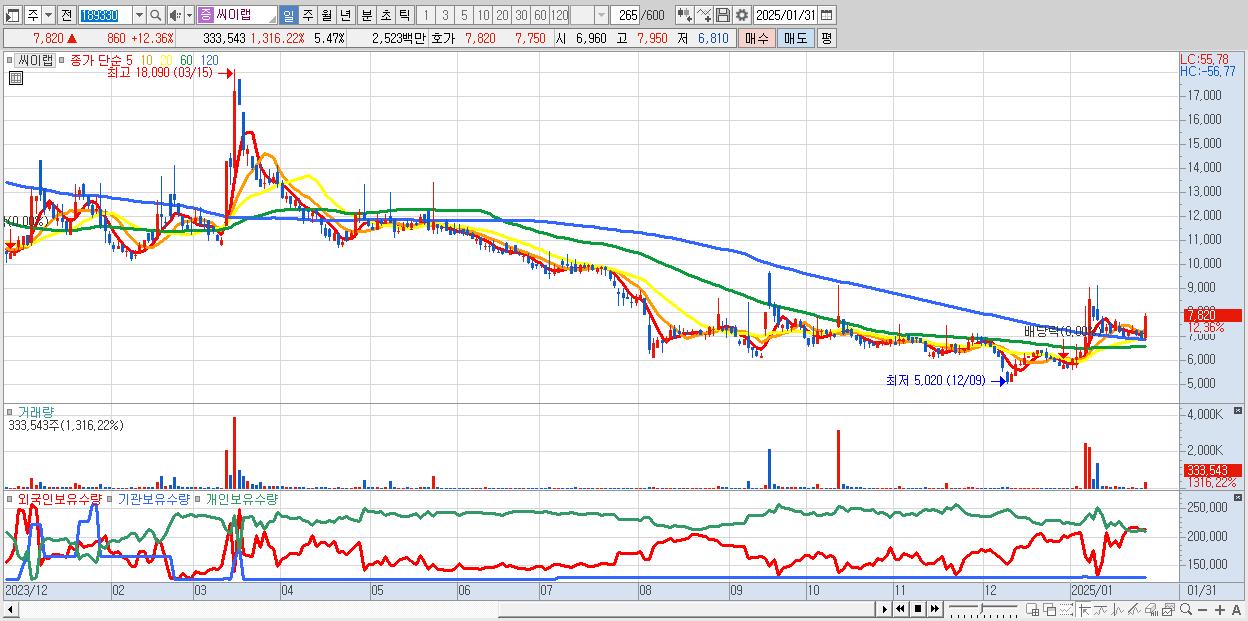 - 씨이랩 (7,820원 ▲ 12.36% , 시총: 476억, 거래량: 333,543, 거래대금:25억)