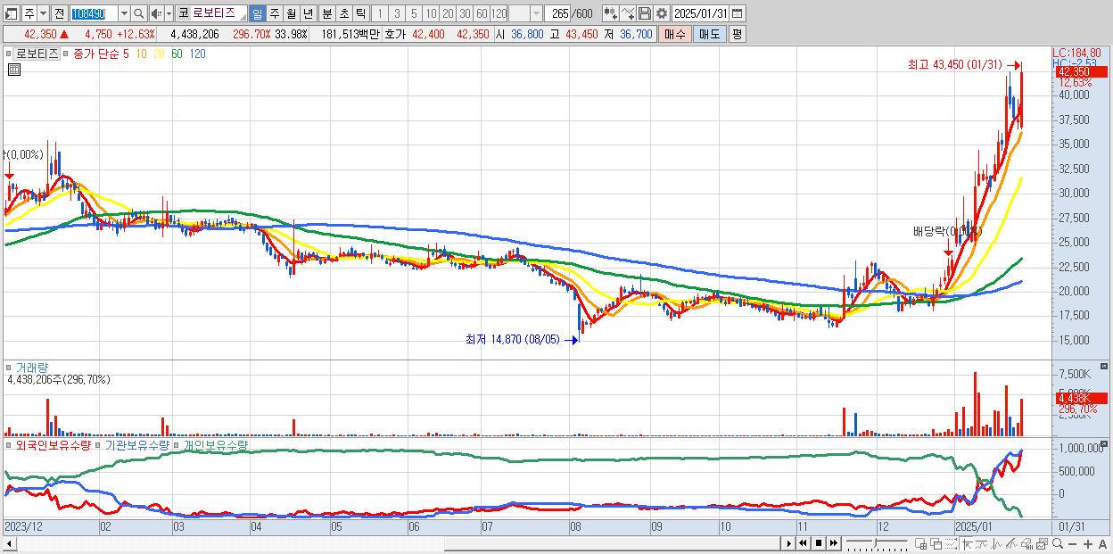- 로보티즈 (42,350원 ▲ 12.63% , 시총: 5,531억, 거래량: 4,438,206, 거래대금:1,815억)