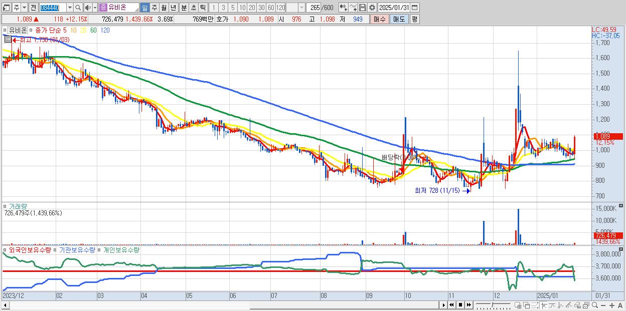 - 유비온 (1,089원 ▲ 12.15% , 시총: 215억, 거래량: 726,479, 거래대금:8억)