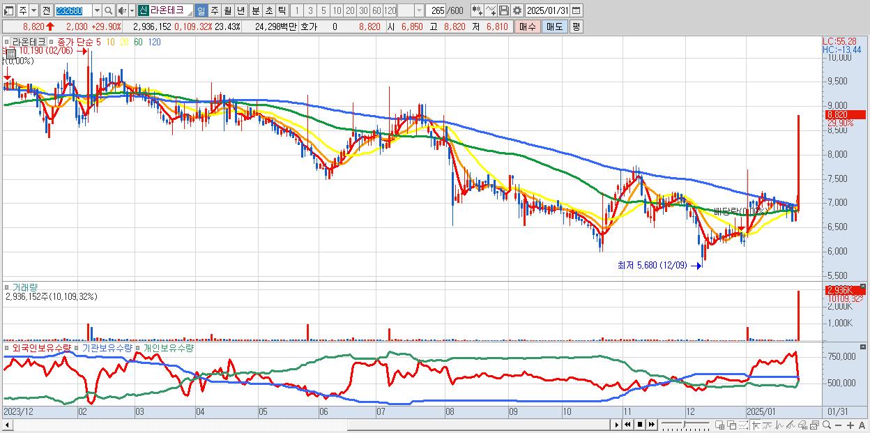 - 라온테크 (8,820원 ▲ 29.9% , 시총: 1,106억, 거래량: 2,936,152, 거래대금:243억)