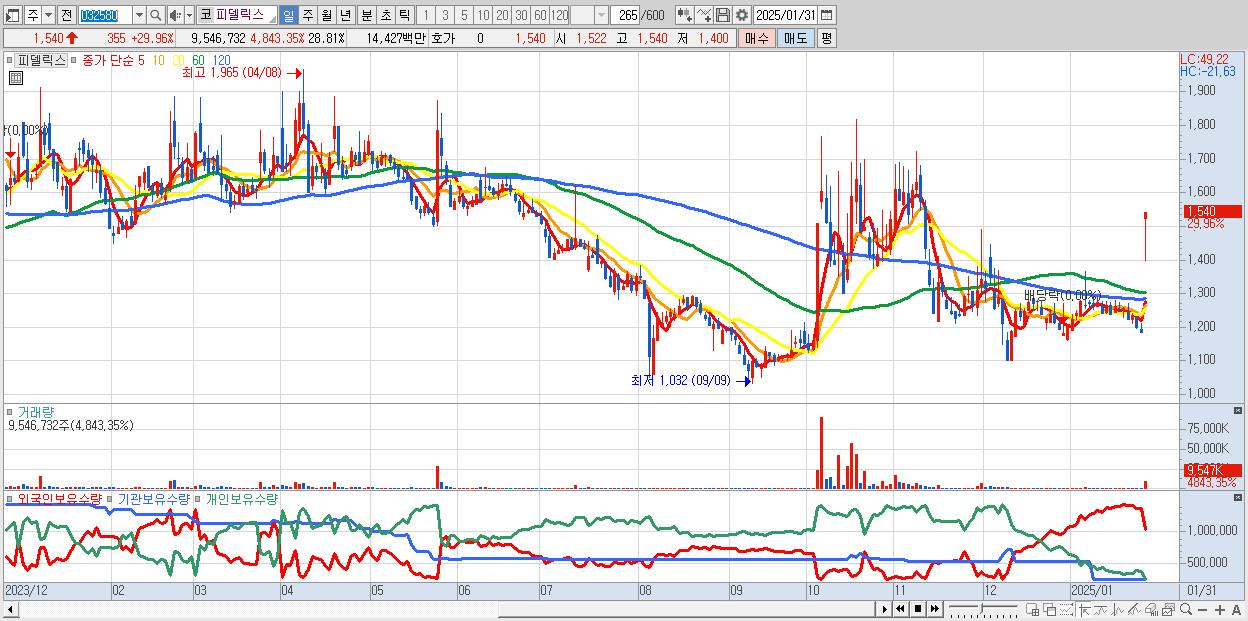 - 피델릭스 (1,540원 ▲ 29.96% , 시총: 510억, 거래량: 9,546,732, 거래대금:144억)