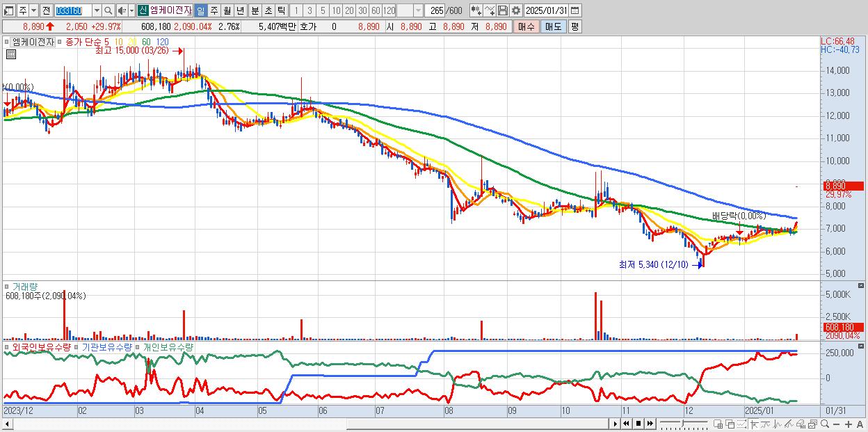 - 엠케이전자 (8,890원 ▲ 29.97% , 시총: 1,962억, 거래량: 608,180, 거래대금:54억)