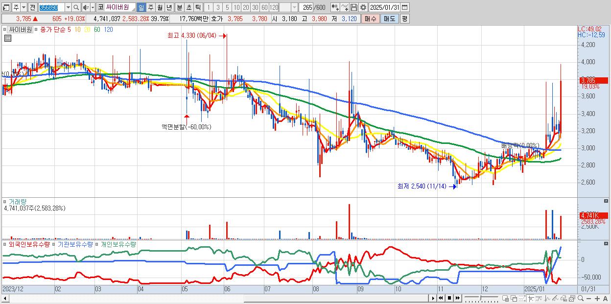 - 싸이버원 (3,785원 ▲ 19.03% , 시총: 451억, 거래량: 4,741,037, 거래대금:178억)