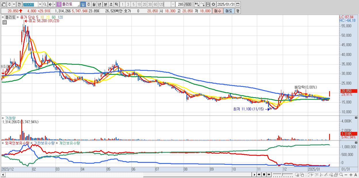 - 플리토 (20,850원 ▲ 29.91% , 시총: 1,147억, 거래량: 1,314,266, 거래대금:265억)