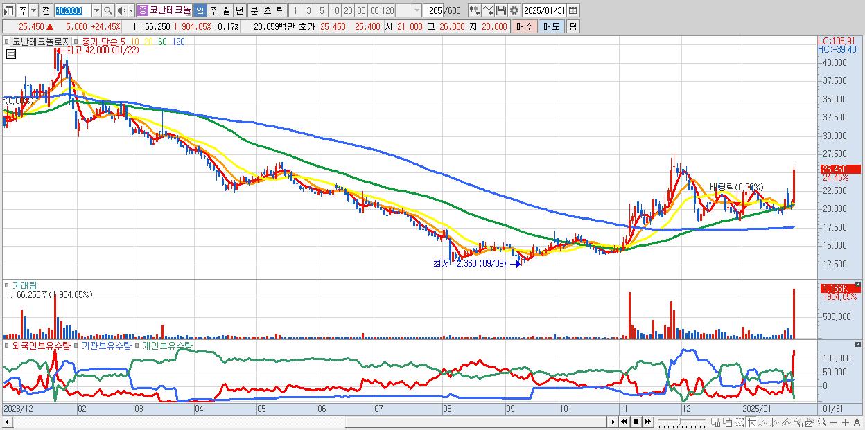 - 코난테크놀로지 (25,450원 ▲ 24.45% , 시총: 2,918억, 거래량: 1,166,250, 거래대금:287억)