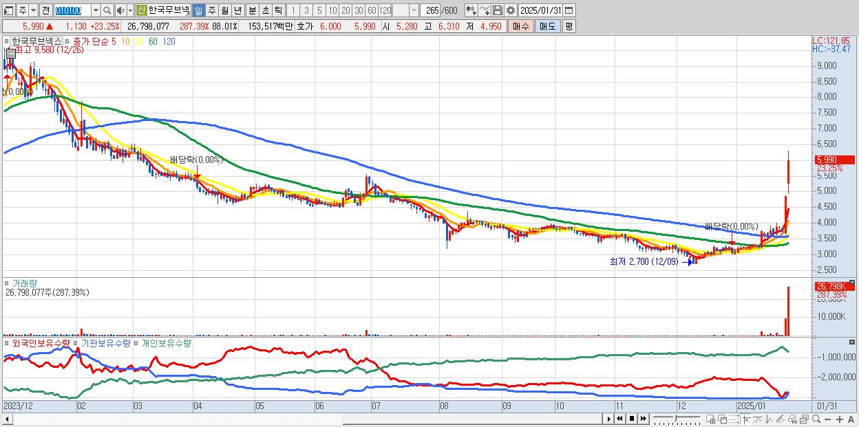 - 한국무브넥스 (5,990원 ▲ 23.25% , 시총: 1,824억, 거래량: 26,798,077, 거래대금:1,535억)