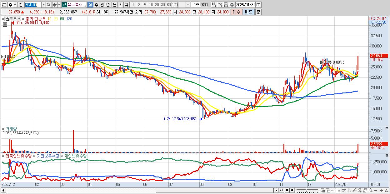 - 솔트룩스 (27,650원 ▲ 18.16% , 시총: 3,354억, 거래량: 2,932,867, 거래대금:779억)