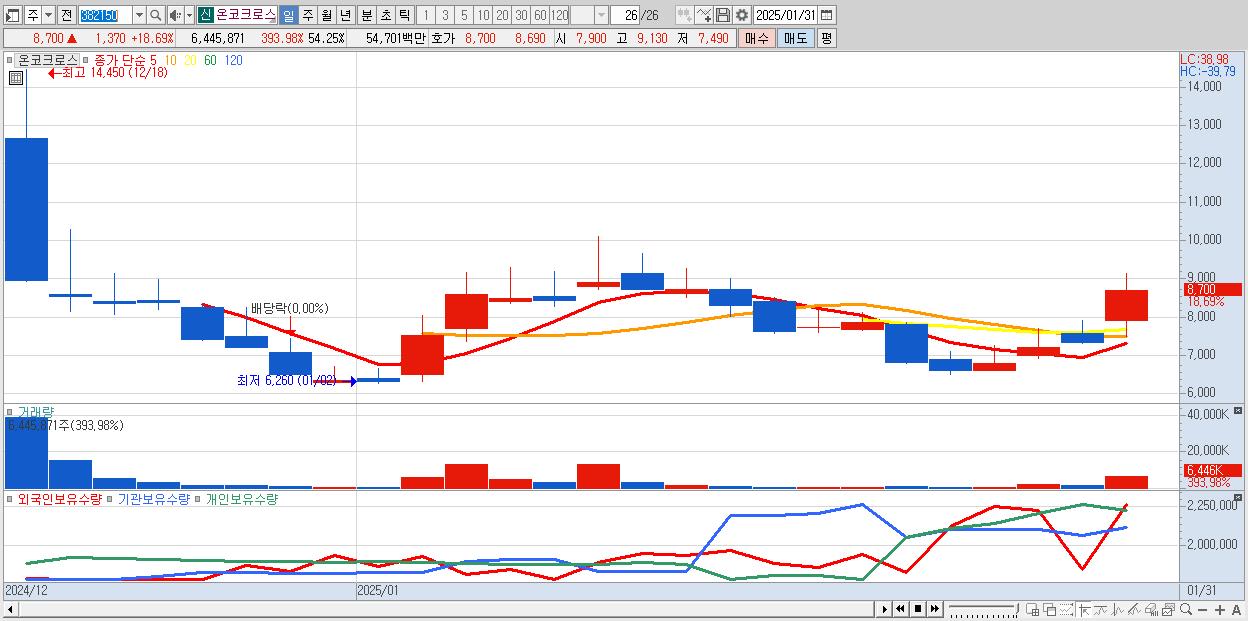 - 온코크로스 (8,700원 ▲ 18.69% , 시총: 1,034억, 거래량: 6,445,871, 거래대금:547억)