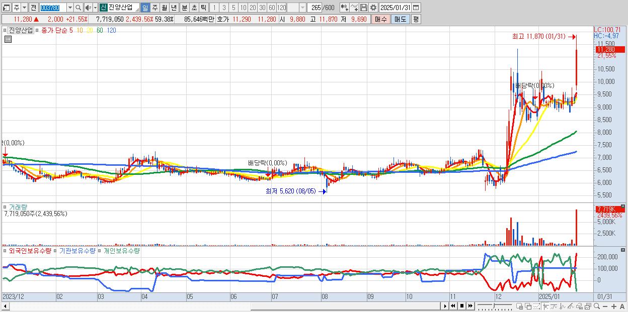 - 진양산업 (11,280원 ▲ 21.55% , 시총: 1,466억, 거래량: 7,719,050, 거래대금:856억)
