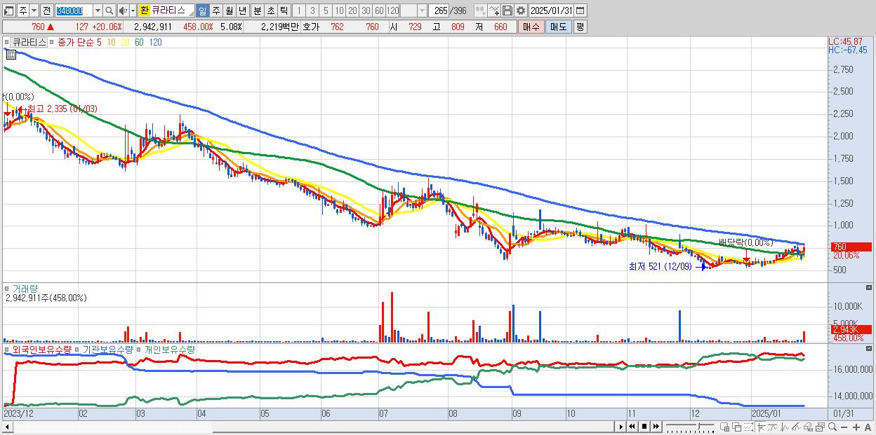 - 큐라티스 (760원 ▲ 20.06% , 시총: 441억, 거래량: 2,942,911, 거래대금:22억)