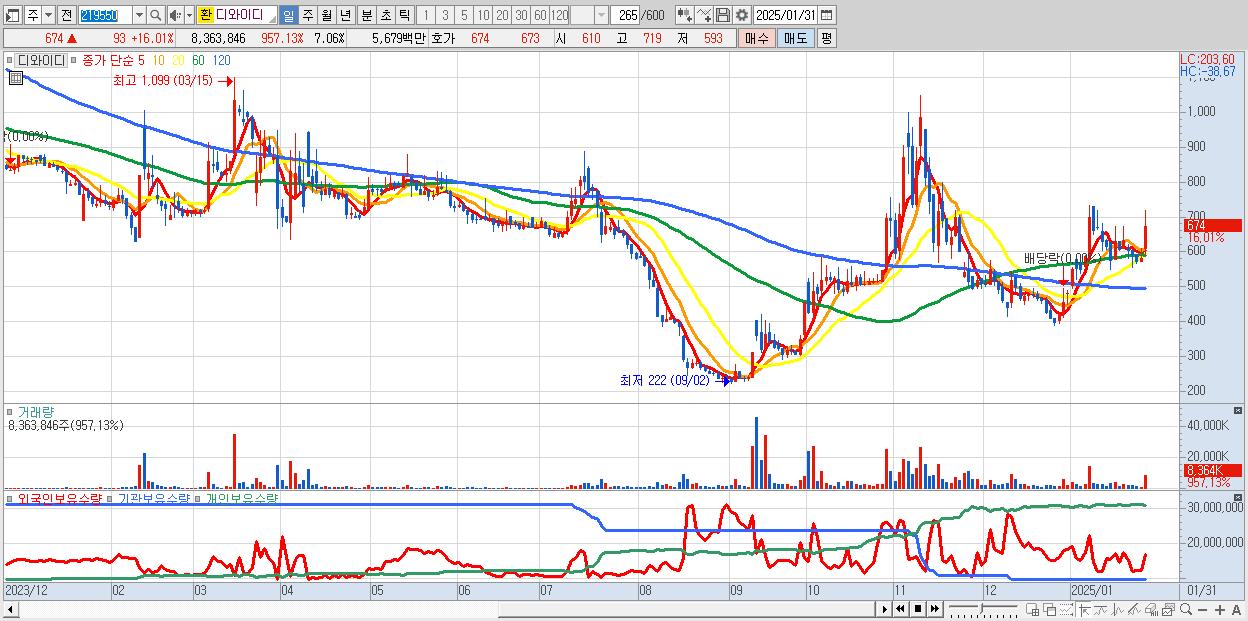 - 디와이디 (674원 ▲ 16.01% , 시총: 798억, 거래량: 8,363,846, 거래대금:57억)