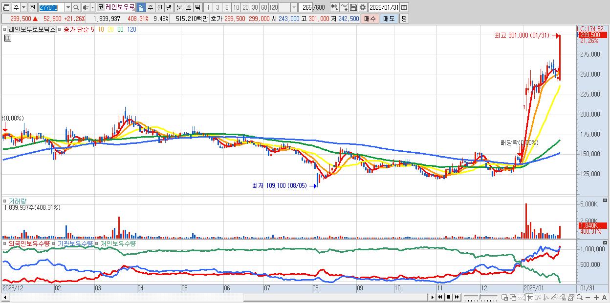 - 레인보우로보틱스 (299,500원 ▲ 21.26% , 시총: 58,103억, 거래량: 1,839,937, 거래대금:5,152억)