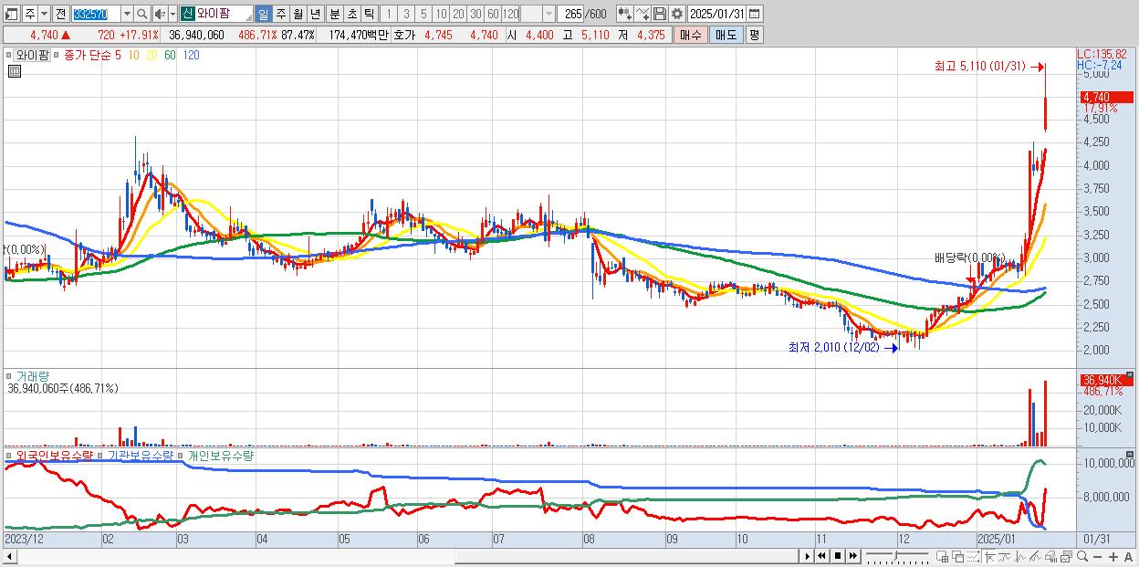 - 와이팜 (4,740원 ▲ 17.91% , 시총: 2,002억, 거래량: 36,940,060, 거래대금:1,745억)