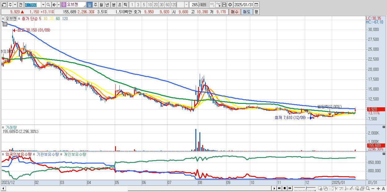 - 오브젠 (9,920원 ▲ 13.11% , 시총: 440억, 거래량: 155,689, 거래대금:15억)