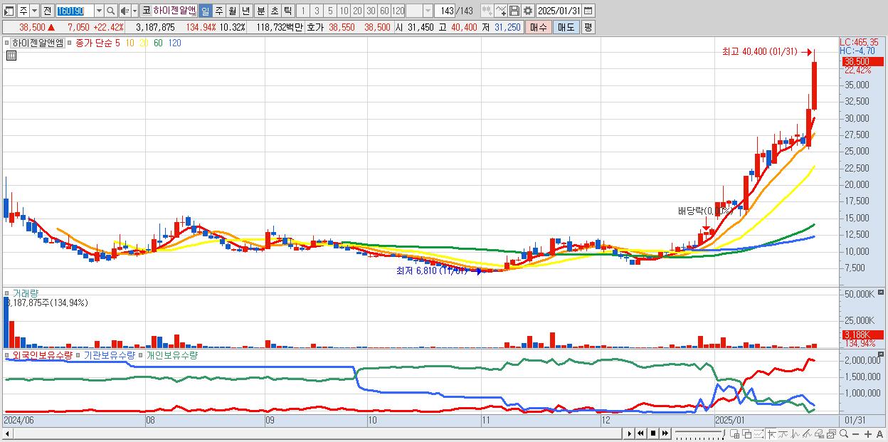 - 하이젠알앤엠 (38,500원 ▲ 22.42% , 시총: 11,892억, 거래량: 3,187,875, 거래대금:1,187억)