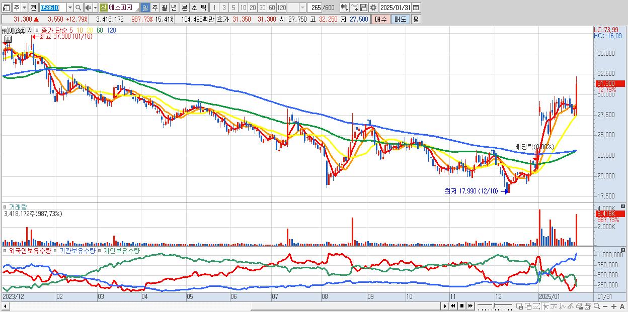 - 에스피지 (31,300원 ▲ 12.79% , 시총: 6,942억, 거래량: 3,418,172, 거래대금:1,045억)