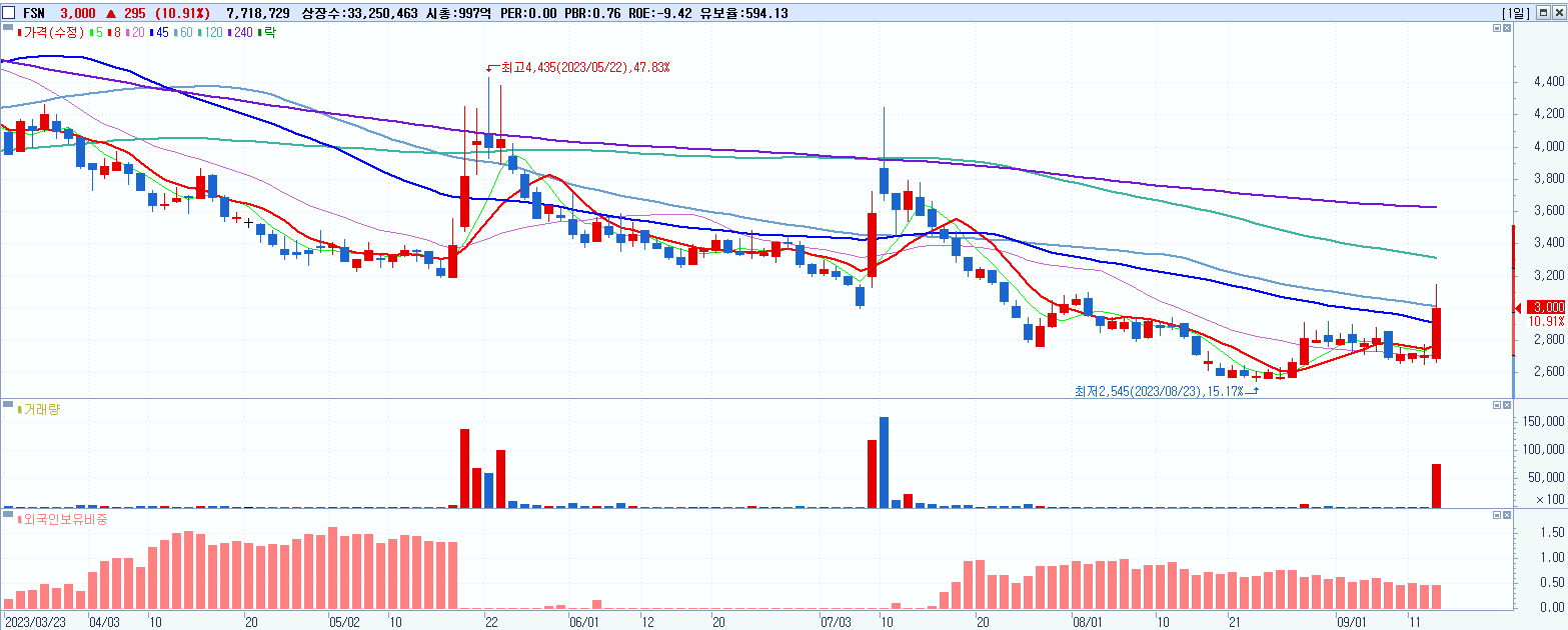 - FSN (3,000원 ▲ 10.91% , 시총: 998억, 거래량: 7,721,357, 거래대금:229억)