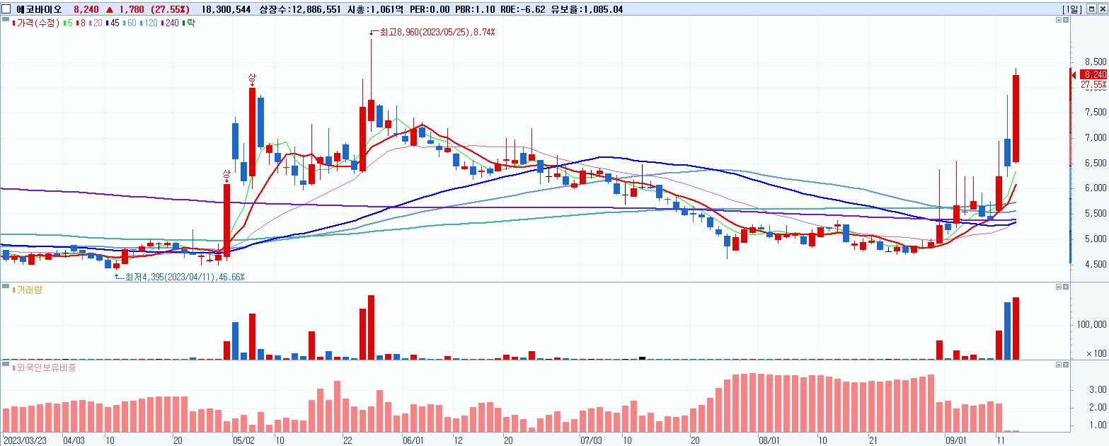 - 에코바이오 (8,240원 ▲ 27.55% , 시총: 1,062억, 거래량: 18,313,178, 거래대금:1,415억)