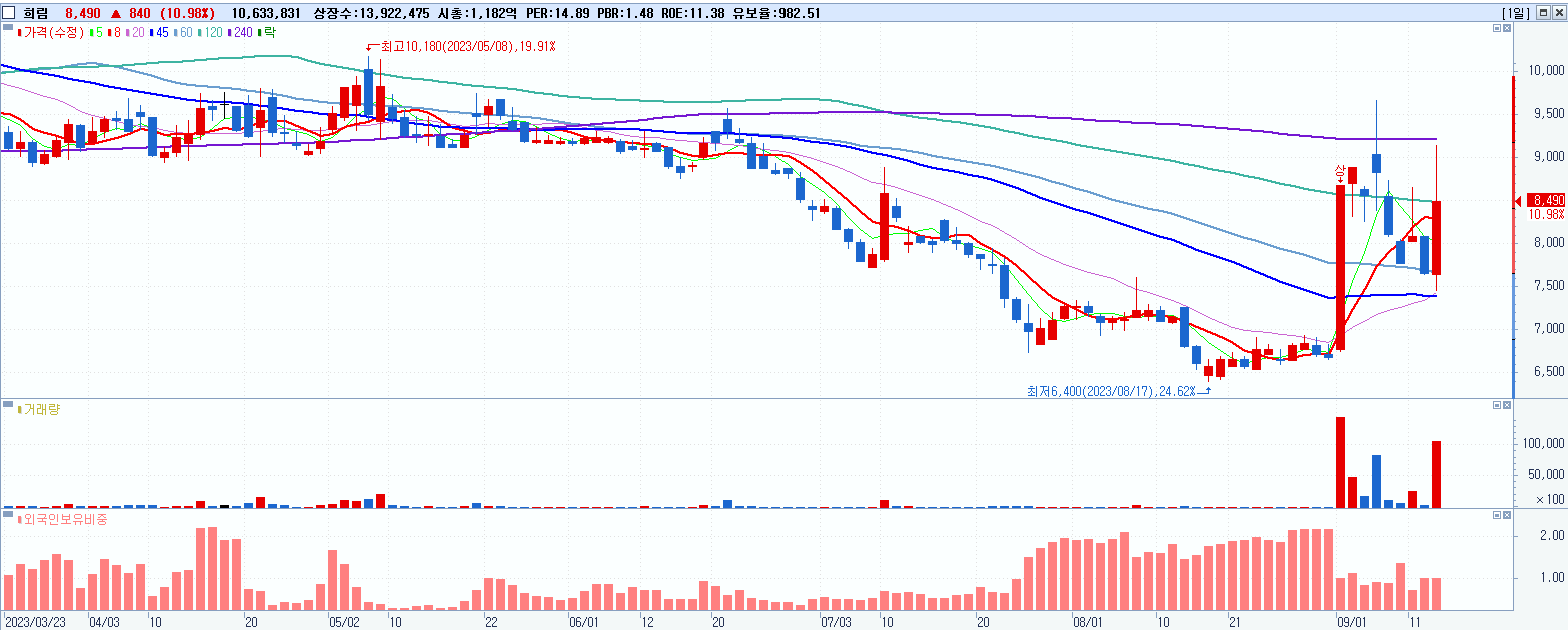 - 희림 (8,490원 ▲ 10.98% , 시총: 1,182억, 거래량: 10,698,169, 거래대금:926억)