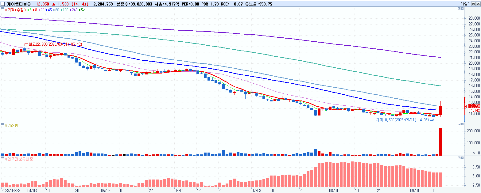 - KG케미칼 (8,910원 ▲ 14.23% , 시총: 6,101억, 거래량: 28,989,165, 거래대금:2,595억)