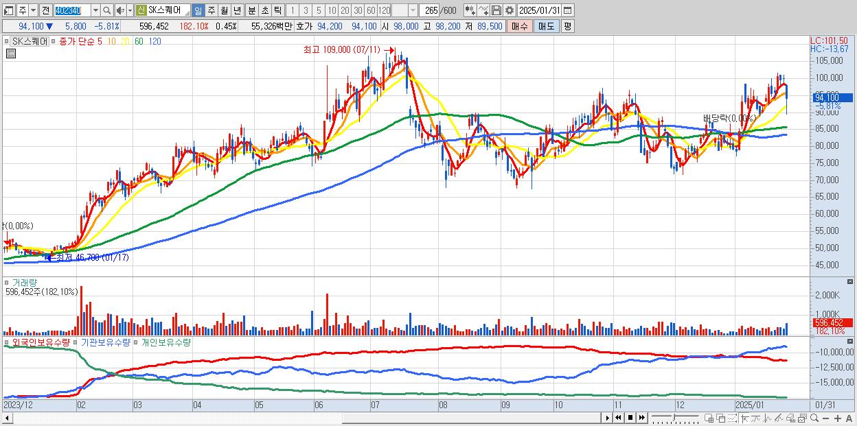 - SK스퀘어 (94,100원 ▼ -5.81% , 시총: 125,669억, 외국인 순매수 거래금:70억)