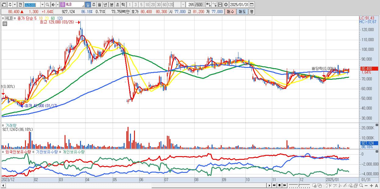 - HLB (80,400원 ▲ 1.64% , 시총: 105,635억, 외국인 순매수 거래금:165억)