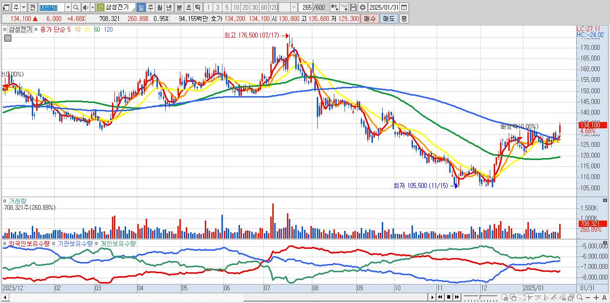 - 삼성전기 (134,100원 ▲ 4.68% , 시총: 100,164억, 외국인 순매수 거래금:119억)