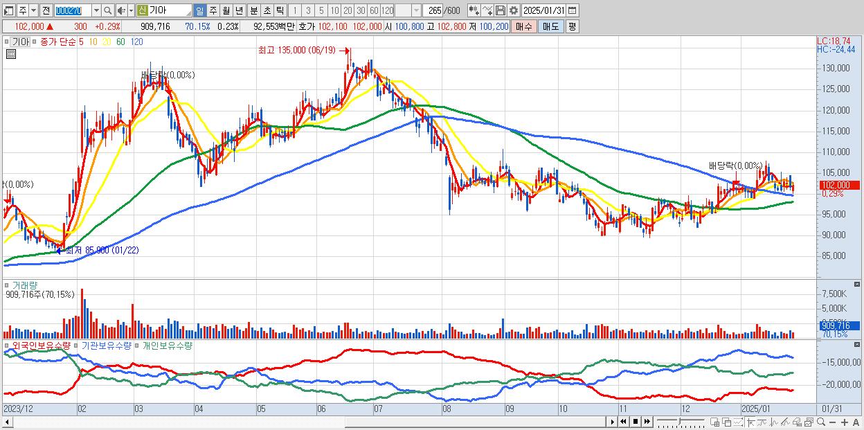 - 기아 (102,000원 ▲ 0.29% , 시총: 405,626억, 외국인 순매수 거래금:85억)