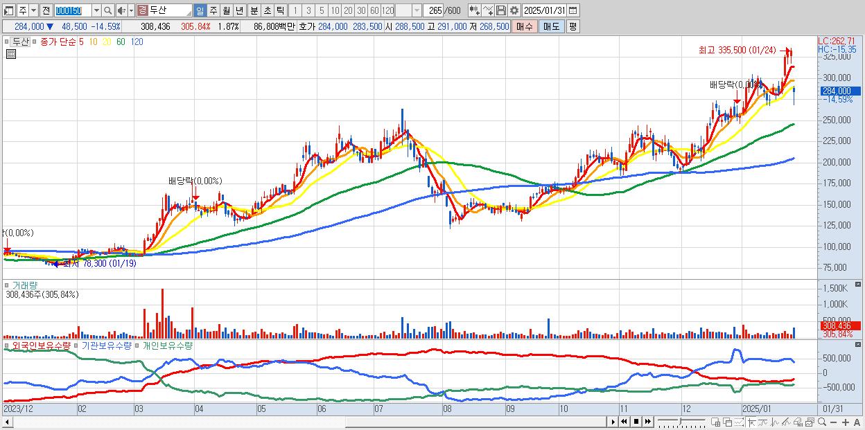 - 두산 (284,000원 ▼ -14.59% , 시총: 46,928억, 외국인 순매수 거래금:140억)