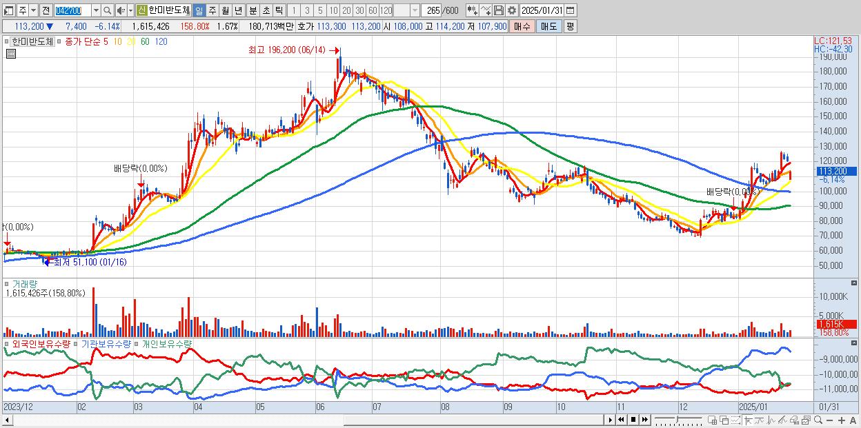 - 한미반도체 (113,200원 ▼ -6.14% , 시총: 109,367억, 외국인 순매수 거래금:222억)
