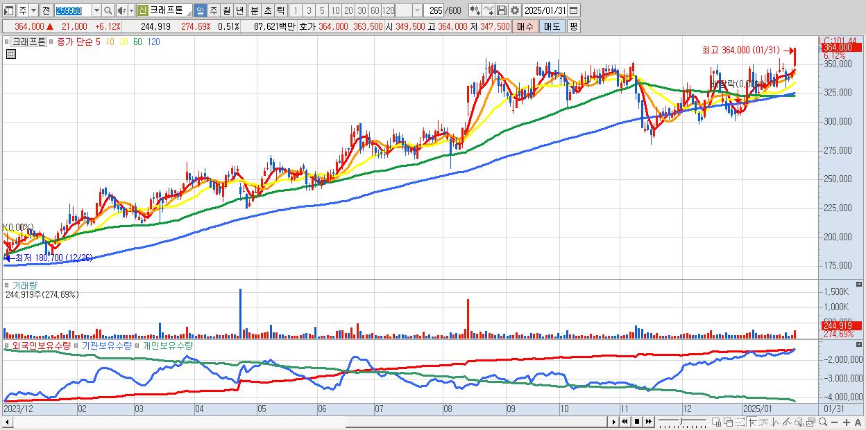 - 크래프톤 (364,000원 ▲ 6.12% , 시총: 174,384억, 외국인 순매수 거래금:259억)