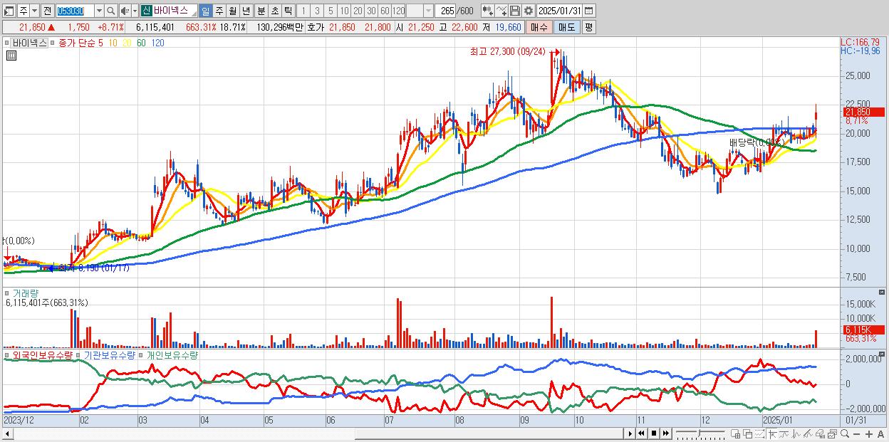 - 바이넥스 (21,850원 ▲ 8.71% , 시총: 7,141억, 거래량: 6,115,401, 거래대금:1,303억)