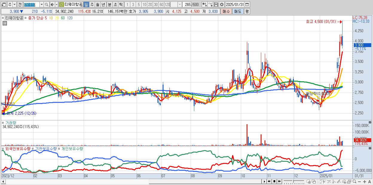 - 티웨이항공 (3,900원 ▼ -5.11% , 시총: 8,400억, 거래량: 34,902,240, 거래대금:1,462억)