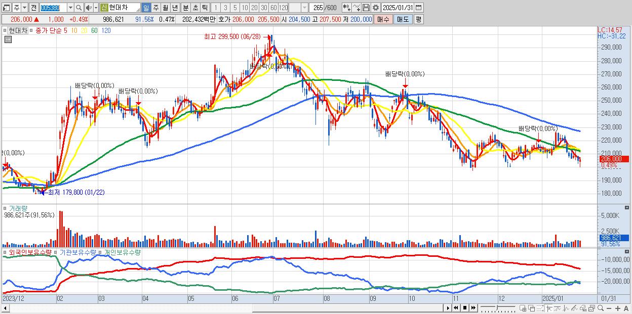 - 현대차 (206,000원 ▲ 0.49% , 시총: 431,397억, 거래량: 986,621, 거래대금:2,024억)