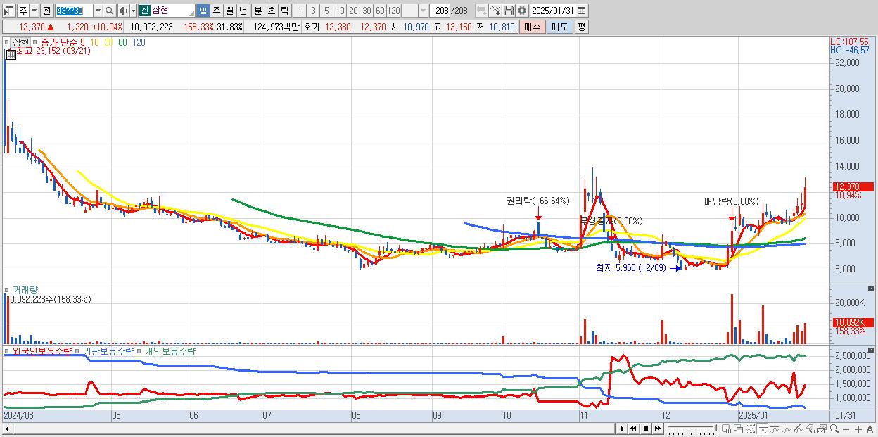 - 삼현 (12,370원 ▲ 10.94% , 시총: 3,922억, 거래량: 10,092,223, 거래대금:1,250억)