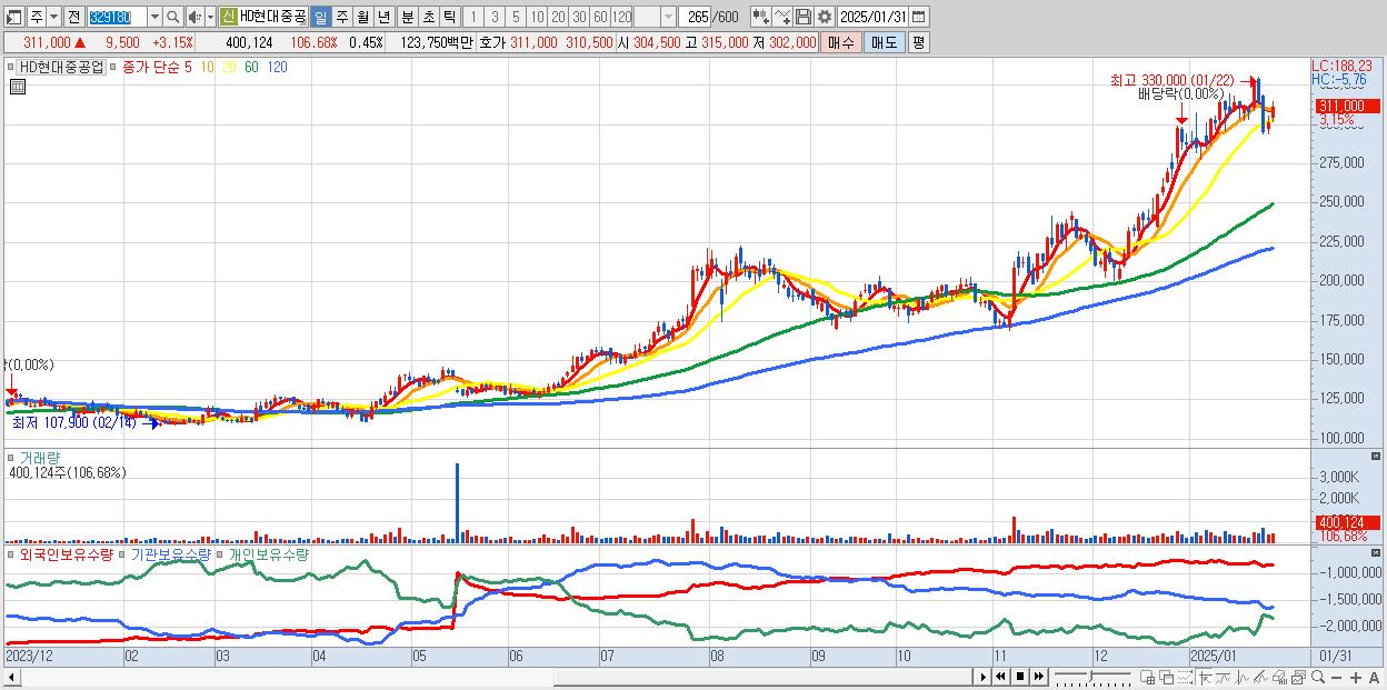- HD현대중공업 (311,000원 ▲ 3.15% , 시총: 276,084억, 거래량: 400,124, 거래대금:1,237억)