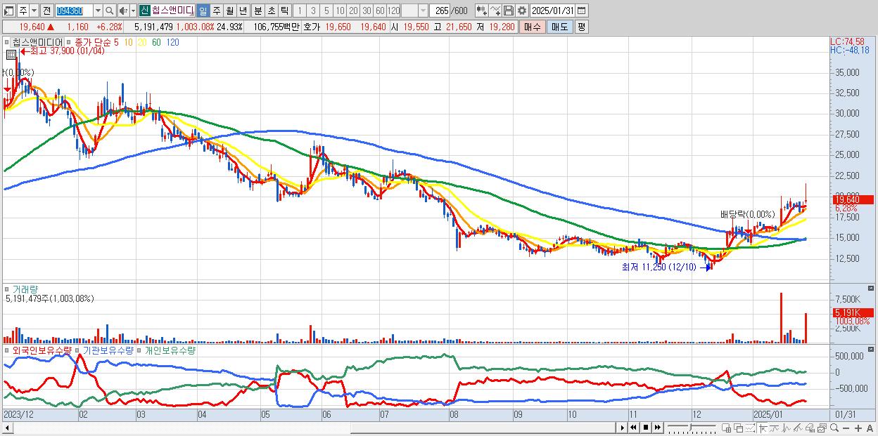 - 칩스앤미디어 (19,640원 ▲ 6.28% , 시총: 4,090억, 거래량: 5,191,479, 거래대금:1,068억)