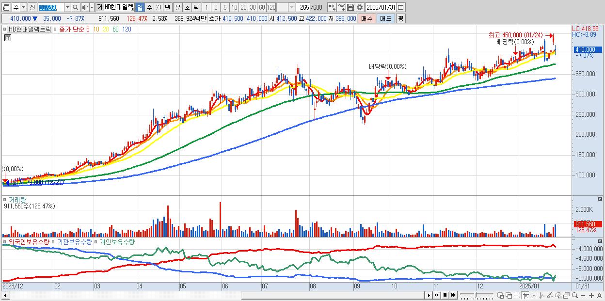 - HD현대일렉트릭 (410,000원 ▼ -7.87% , 시총: 147,793억, 거래량: 911,560, 거래대금:3,699억)