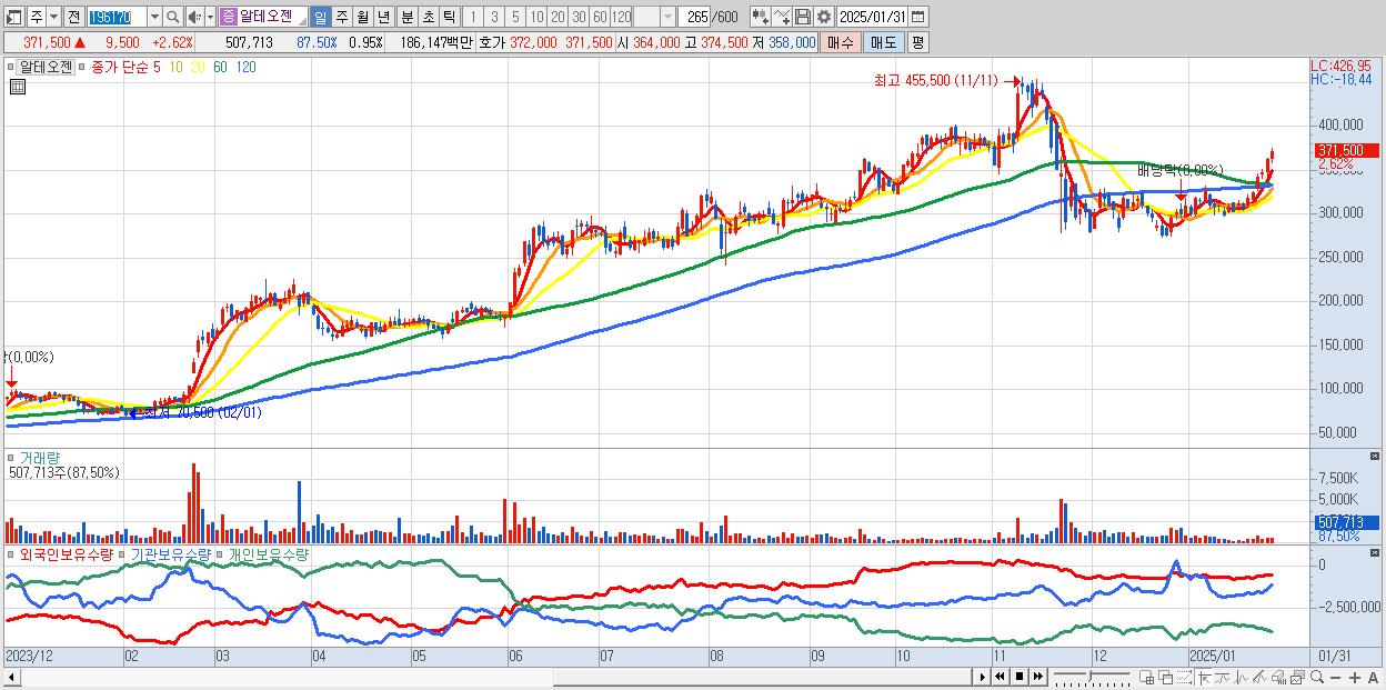 - 알테오젠 (371,500원 ▲ 2.62% , 시총: 198,079억, 거래량: 507,713, 거래대금:1,861억)