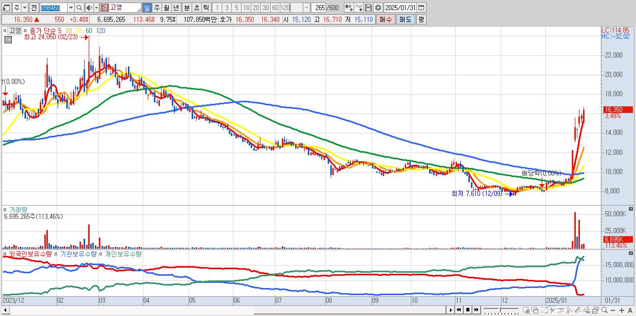- 고영 (16,350원 ▲ 3.48% , 시총: 11,225억, 거래량: 6,695,265, 거래대금:1,079억)
