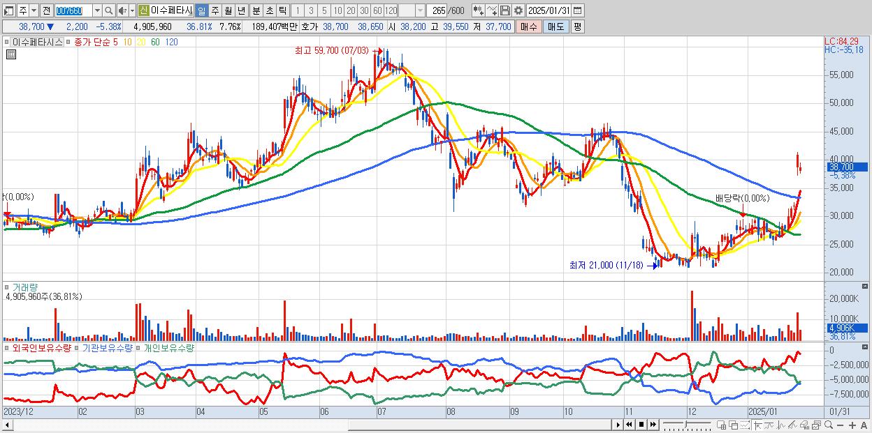- 이수페타시스 (38,700원 ▼ -5.38% , 시총: 24,476억, 거래량: 4,905,960, 거래대금:1,894억)